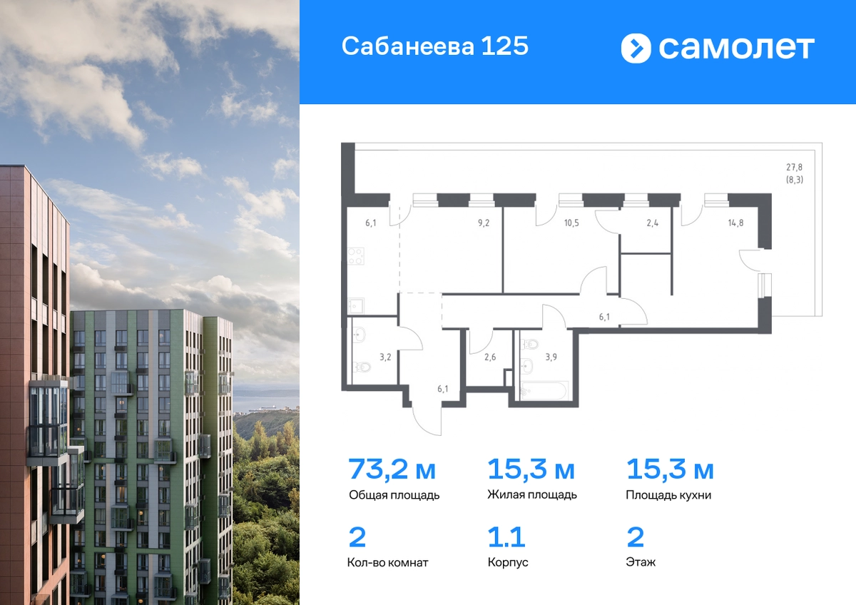 Строим кварталы для жизни с заботой о будущем. Предлагается 2-комнатная квартира комфорт-класса 73,2 кв.м в корпусе 1.1 на 2 этаже, в ЖК «Сабанеева 125» Квартира без отделки. Доступность опции «отделка» и возможность комплектации мебелью и декором уточняйте у застройщика. Приобрести квартиру возможно по специальным акциям от застройщика, с текущими условиями акций можно ознакомиться в блоке «Акций». Цена динамическая и может отличаться, уточняйте актуальность у застройщика. В жилом комплексе «Сабанеева 125» вы ежедневно будете наслаждаться видами сопок. Холмистый рельеф защищает территорию от ветра. Комплекс расположен в Первореченском районе Владивостока, всего в 20 минутах на машине до центра города. На первых этажах откроются супермаркеты, кафе и пекарни. Для малышей — детский сад в 2 минутах пешком и школа в 10 минутах. За 6 минут можно доехать до Нагорного парка, а за 15 минут — до набережной Цесаревича с панорамой Золотого моста. Комплекс состоит из 3 монолитных домов высотой 25 этажей с фасадами, дизайн которых вдохновлен птицами Дальнего Востока. Дворы оформлены как сад с дальневосточной флорой, есть смотровые площадки, скалодром, перголы и игровые зоны для детей. Подземный паркинг — трехуровневый. В сквозные подъезды без ступеней и с помещением для колясок удобно заходить. В жилом комплексе «Сабанеева 125» есть квартиры с индивидуальными зелеными террасами, увеличенными окнами и панорамными балконами для чаепитий с видом на сопки и залив.#yan19-2r1765246#О застройщике