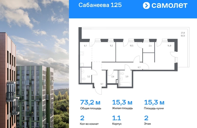 Строим кварталы для жизни с заботой о будущем. Предлагается 2-комнатная квартира комфорт-класса 73,2 кв.м в корпусе 1.1 на 2 этаже, в ЖК «Сабанеева 125» Квартира без отделки. Доступность опции «отделка» и возможность комплектации мебелью и декором уточняйте у застройщика. Приобрести квартиру возможно по специальным акциям от застройщика, с текущими условиями акций можно ознакомиться в блоке «Акций». Цена динамическая и может отличаться, уточняйте актуальность у застройщика. В жилом комплексе «Сабанеева 125» вы ежедневно будете наслаждаться видами сопок. Холмистый рельеф защищает территорию от ветра. Комплекс расположен в Первореченском районе Владивостока, всего в 20 минутах на машине до центра города. На первых этажах откроются супермаркеты, кафе и пекарни. Для малышей — детский сад в 2 минутах пешком и школа в 10 минутах. За 6 минут можно доехать до Нагорного парка, а за 15 минут — до набережной Цесаревича с панорамой Золотого моста. Комплекс состоит из 3 монолитных домов высотой 25 этажей с фасадами, дизайн которых вдохновлен птицами Дальнего Востока. Дворы оформлены как сад с дальневосточной флорой, есть смотровые площадки, скалодром, перголы и игровые зоны для детей. Подземный паркинг — трехуровневый. В сквозные подъезды без ступеней и с помещением для колясок удобно заходить. В жилом комплексе «Сабанеева 125» есть квартиры с индивидуальными зелеными террасами, увеличенными окнами и панорамными балконами для чаепитий с видом на сопки и залив.#yan19-2r1765246#О застройщике