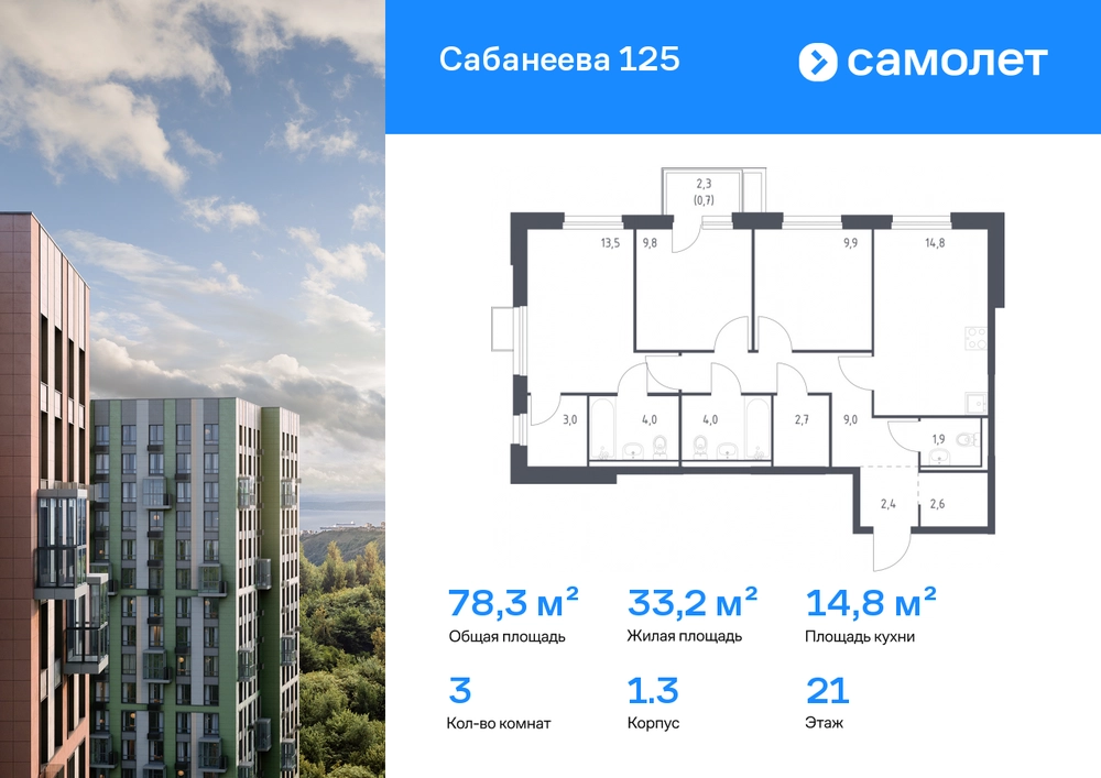 Строим кварталы для жизни с заботой о будущем. Предлагается 3-комнатная квартира комфорт-класса 78,3 кв.м в корпусе 1.3 на 21 этаже, в ЖК «Сабанеева 125» Квартира без отделки. Доступность опции «отделка» и возможность комплектации мебелью и декором уточняйте у застройщика. Приобрести квартиру возможно по специальным акциям от застройщика, с текущими условиями акций можно ознакомиться в блоке «Акций». Цена динамическая и может отличаться, уточняйте актуальность у застройщика. В жилом комплексе «Сабанеева 125» вы ежедневно будете наслаждаться видами сопок. Холмистый рельеф защищает территорию от ветра. Комплекс расположен в Первореченском районе Владивостока, всего в 20 минутах на машине до центра города. На первых этажах откроются супермаркеты, кафе и пекарни. Для малышей — детский сад в 2 минутах пешком и школа в 10 минутах. За 6 минут можно доехать до Нагорного парка, а за 15 минут — до набережной Цесаревича с панорамой Золотого моста. Комплекс состоит из 3 монолитных домов высотой 25 этажей с фасадами, дизайн которых вдохновлен птицами Дальнего Востока. Дворы оформлены как сад с дальневосточной флорой, есть смотровые площадки, скалодром, перголы и игровые зоны для детей. Подземный паркинг — трехуровневый. В сквозные подъезды без ступеней и с помещением для колясок удобно заходить. В жилом комплексе «Сабанеева 125» есть квартиры с индивидуальными зелеными террасами, увеличенными окнами и панорамными балконами для чаепитий с видом на сопки и залив.#yan19-2r1807886#О застройщике