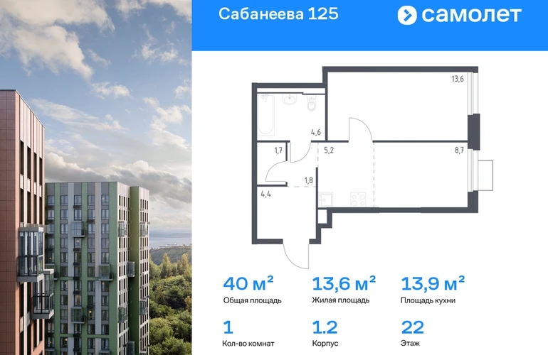 Строим кварталы для жизни с заботой о будущем. Предлагается 1-комнатная квартира комфорт-класса 40 кв.м в корпусе 1.2 на 22 этаже, в ЖК «Сабанеева 125» Квартира без отделки. Доступность опции «отделка» и возможность комплектации мебелью и декором уточняйте у застройщика. Приобрести квартиру возможно по специальным акциям от застройщика, с текущими условиями акций можно ознакомиться в блоке «Акций». Цена динамическая и может отличаться, уточняйте актуальность у застройщика. В жилом комплексе «Сабанеева 125» вы ежедневно будете наслаждаться видами сопок. Холмистый рельеф защищает территорию от ветра. Комплекс расположен в Первореченском районе Владивостока, всего в 20 минутах на машине до центра города. На первых этажах откроются супермаркеты, кафе и пекарни. Для малышей — детский сад в 2 минутах пешком и школа в 10 минутах. За 6 минут можно доехать до Нагорного парка, а за 15 минут — до набережной Цесаревича с панорамой Золотого моста. Комплекс состоит из 3 монолитных домов высотой 25 этажей с фасадами, дизайн которых вдохновлен птицами Дальнего Востока. Дворы оформлены как сад с дальневосточной флорой, есть смотровые площадки, скалодром, перголы и игровые зоны для детей. Подземный паркинг — трехуровневый. В сквозные подъезды без ступеней и с помещением для колясок удобно заходить. В жилом комплексе «Сабанеева 125» есть квартиры с индивидуальными зелеными террасами, увеличенными окнами и панорамными балконами для чаепитий с видом на сопки и залив.#yan19-2r1807926#О застройщике