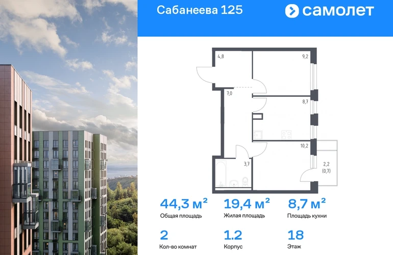 Строим кварталы для жизни с заботой о будущем. Предлагается 2-комнатная квартира комфорт-класса 44,3 кв.м в корпусе 1.2 на 18 этаже, в ЖК «Сабанеева 125» Квартира без отделки. Доступность опции «отделка» и возможность комплектации мебелью и декором уточняйте у застройщика. Приобрести квартиру возможно по специальным акциям от застройщика, с текущими условиями акций можно ознакомиться в блоке «Акций». Цена динамическая и может отличаться, уточняйте актуальность у застройщика. В жилом комплексе «Сабанеева 125» вы ежедневно будете наслаждаться видами сопок. Холмистый рельеф защищает территорию от ветра. Комплекс расположен в Первореченском районе Владивостока, всего в 20 минутах на машине до центра города. На первых этажах откроются супермаркеты, кафе и пекарни. Для малышей — детский сад в 2 минутах пешком и школа в 10 минутах. За 6 минут можно доехать до Нагорного парка, а за 15 минут — до набережной Цесаревича с панорамой Золотого моста. Комплекс состоит из 3 монолитных домов высотой 25 этажей с фасадами, дизайн которых вдохновлен птицами Дальнего Востока. Дворы оформлены как сад с дальневосточной флорой, есть смотровые площадки, скалодром, перголы и игровые зоны для детей. Подземный паркинг — трехуровневый. В сквозные подъезды без ступеней и с помещением для колясок удобно заходить. В жилом комплексе «Сабанеева 125» есть квартиры с индивидуальными зелеными террасами, увеличенными окнами и панорамными балконами для чаепитий с видом на сопки и залив.#yan19-2r1807936#О застройщике