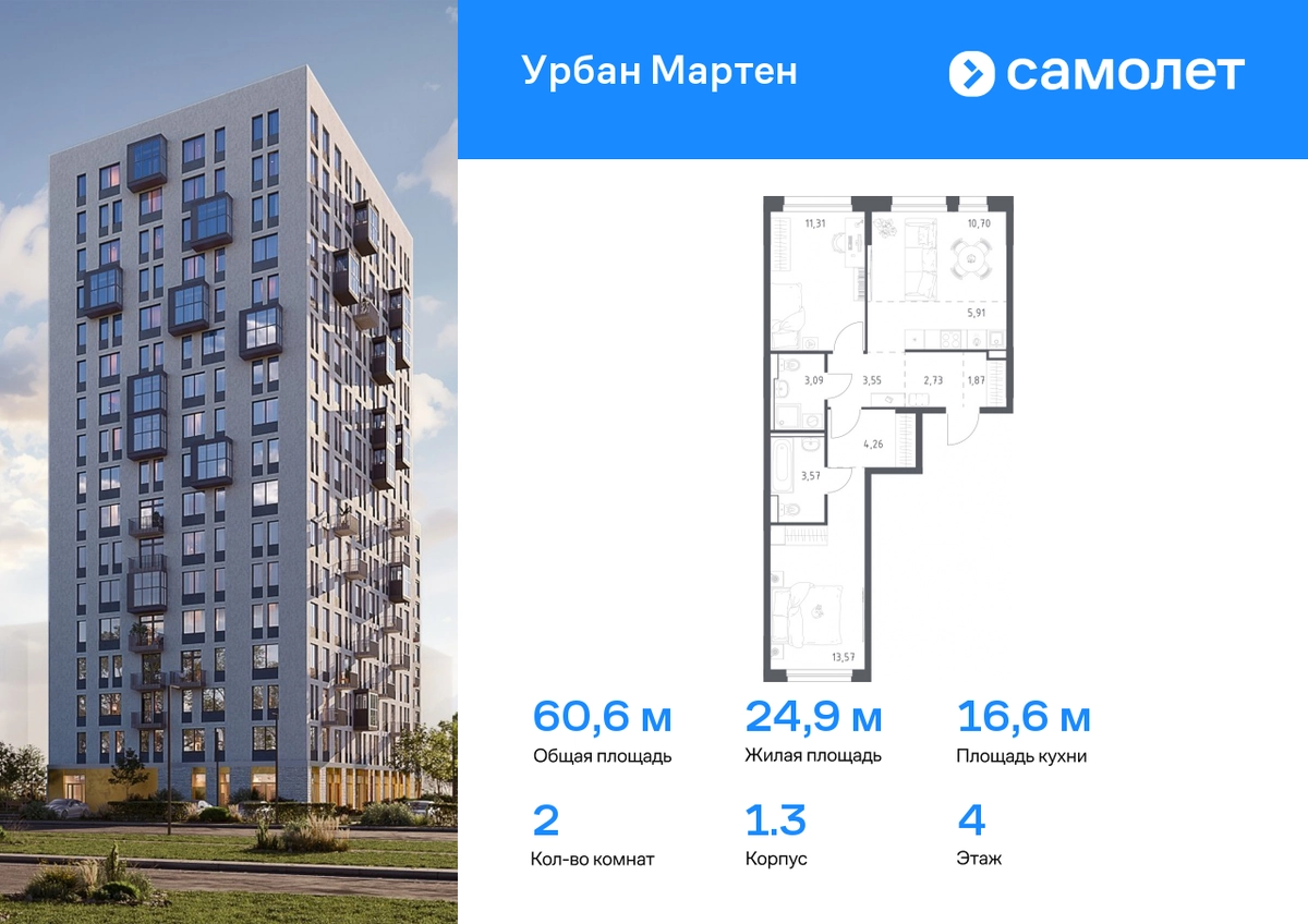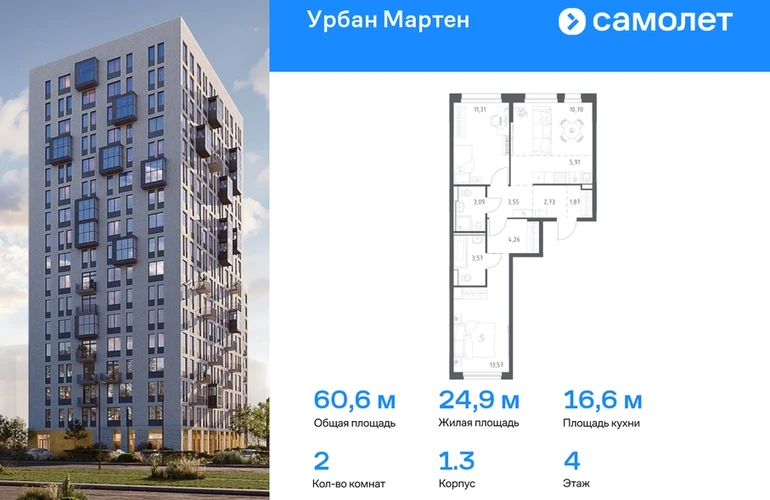 Предлагается 2-комнатная квартира комфорт-класса 60,56 кв.м в корпусе 1.3 на 4 этаже, в ЖК «Урбан Мартен» Квартира без отделки. Доступность опции "отделка" и возможность комплектации мебелью и декором уточняйте у застройщика. Приобрести квартиру возможно по специальным акциям от застройщика, с текущими условиями акций можно ознакомиться в блоке “Акций”. Цена динамическая и может отличаться, уточняйте актуальность у застройщика. В жилом комплексе «Урбан Мартен» у вас будет собственная Уфа: домашняя, неторопливая, теплая. Здесь дети будут играть во дворе без машин в догонялки, собака сможет бегать за палкой по пляжу, а с соседями получится встречаться не только у лифта, но и на утренних занятиях йогой на зеленой лужайке рядом с домом. Жилой комплекс «Урбан Мартен» находится в Демском районе — самом тихом и зеленом в Уфе. Здесь можно открывать окна нараспашку, чтобы квартира наполнялась свежим воздухом, и наблюдать с балкона, как покачиваются макушки деревьев. #yan19-2r1737176#О застройщике