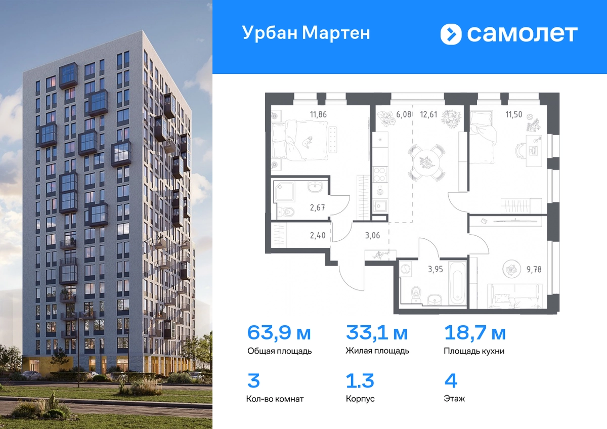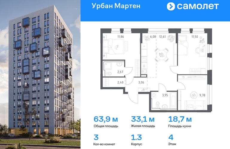 Предлагается 3-комнатная квартира комфорт-класса 63,91 кв.м в корпусе 1.3 на 4 этаже, в ЖК «Урбан Мартен» Квартира без отделки. Доступность опции "отделка" и возможность комплектации мебелью и декором уточняйте у застройщика. Приобрести квартиру возможно по специальным акциям от застройщика, с текущими условиями акций можно ознакомиться в блоке “Акций”. Цена динамическая и может отличаться, уточняйте актуальность у застройщика. В жилом комплексе «Урбан Мартен» у вас будет собственная Уфа: домашняя, неторопливая, теплая. Здесь дети будут играть во дворе без машин в догонялки, собака сможет бегать за палкой по пляжу, а с соседями получится встречаться не только у лифта, но и на утренних занятиях йогой на зеленой лужайке рядом с домом. Жилой комплекс «Урбан Мартен» находится в Демском районе — самом тихом и зеленом в Уфе. Здесь можно открывать окна нараспашку, чтобы квартира наполнялась свежим воздухом, и наблюдать с балкона, как покачиваются макушки деревьев. #yan19-2r1737182#О застройщике