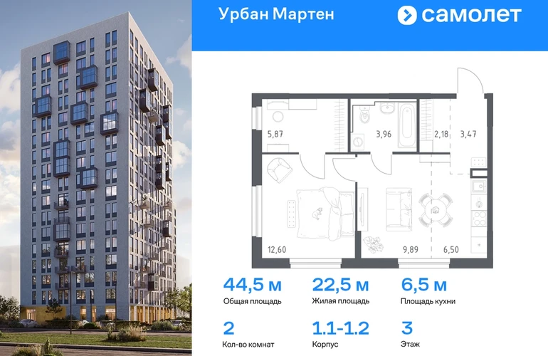 Строим кварталы для жизни с заботой о будущем. Предлагается 2-комнатная квартира комфорт-класса 44,66 кв.м в корпусе 1.1-1.2 на 3 этаже, в ЖК «Урбан Мартен» Квартира с чистовой отделкой. Доступность дополнительных опций уточняйте у застройщика. Приобрести квартиру возможно по специальным акциям от застройщика, с текущими условиями акций можно ознакомиться в блоке «Акций». Цена динамическая и может отличаться, уточняйте актуальность у застройщика. В жилом комплексе «Урбан Мартен» у вас будет собственная Уфа: домашняя, неторопливая, теплая. Здесь дети будут играть во дворе без машин в догонялки, собака сможет бегать за палкой по пляжу, а с соседями получится встречаться не только у лифта, но и на утренних занятиях йогой на зеленой лужайке рядом с домом. Жилой комплекс «Урбан Мартен» находится в Демском районе — самом тихом и зеленом в Уфе. Здесь можно открывать окна нараспашку, чтобы квартира наполнялась свежим воздухом, и наблюдать с балкона, как покачиваются макушки деревьев. #yan19-2r1746723#О застройщике