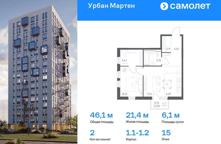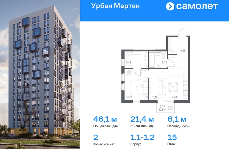 Строим кварталы для жизни с заботой о будущем. Предлагается 2-комнатная квартира комфорт-класса 46,16 кв.м в корпусе 1.1-1.2 на 15 этаже, в ЖК «Урбан Мартен» Квартира с предчистовой отделкой. Доступность дополнительных опций уточняйте у застройщика. Приобрести квартиру возможно по специальным акциям от застройщика, с текущими условиями акций можно ознакомиться в блоке «Акций». Цена динамическая и может отличаться, уточняйте актуальность у застройщика. В жилом комплексе «Урбан Мартен» у вас будет собственная Уфа: домашняя, неторопливая, теплая. Здесь дети будут играть во дворе без машин в догонялки, собака сможет бегать за палкой по пляжу, а с соседями получится встречаться не только у лифта, но и на утренних занятиях йогой на зеленой лужайке рядом с домом. Жилой комплекс «Урбан Мартен» находится в Демском районе — самом тихом и зеленом в Уфе. Здесь можно открывать окна нараспашку, чтобы квартира наполнялась свежим воздухом, и наблюдать с балкона, как покачиваются макушки деревьев. #yan19-2r1753895#О застройщике