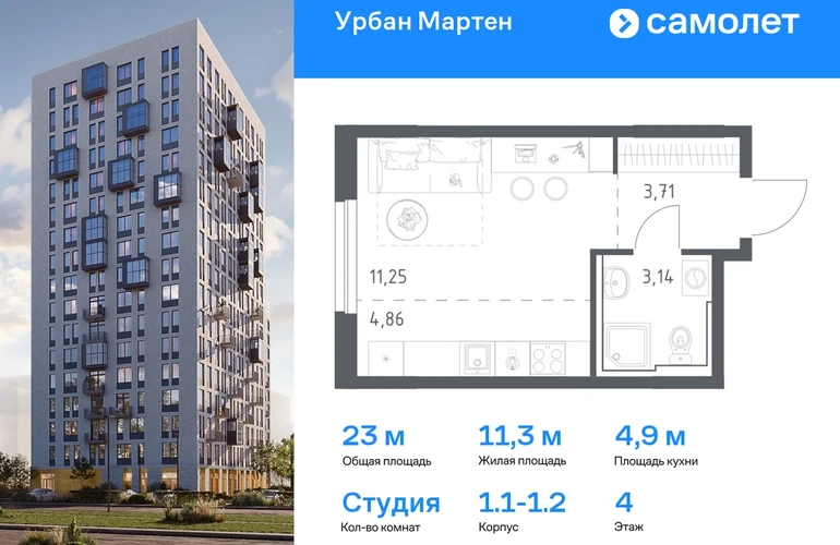Строим кварталы для жизни с заботой о будущем. Предлагается квартира студия комфорт-класса 23,07 кв.м в корпусе 1.1-1.2 на 4 этаже, в ЖК «Урбан Мартен» Квартира с чистовой отделкой. Доступность дополнительных опций уточняйте у застройщика. Приобрести квартиру возможно по специальным акциям от застройщика, с текущими условиями акций можно ознакомиться в блоке «Акций». Цена динамическая и может отличаться, уточняйте актуальность у застройщика. В жилом комплексе «Урбан Мартен» у вас будет собственная Уфа: домашняя, неторопливая, теплая. Здесь дети будут играть во дворе без машин в догонялки, собака сможет бегать за палкой по пляжу, а с соседями получится встречаться не только у лифта, но и на утренних занятиях йогой на зеленой лужайке рядом с домом. Жилой комплекс «Урбан Мартен» находится в Демском районе — самом тихом и зеленом в Уфе. Здесь можно открывать окна нараспашку, чтобы квартира наполнялась свежим воздухом, и наблюдать с балкона, как покачиваются макушки деревьев. #yan19-2r1758294#О застройщике