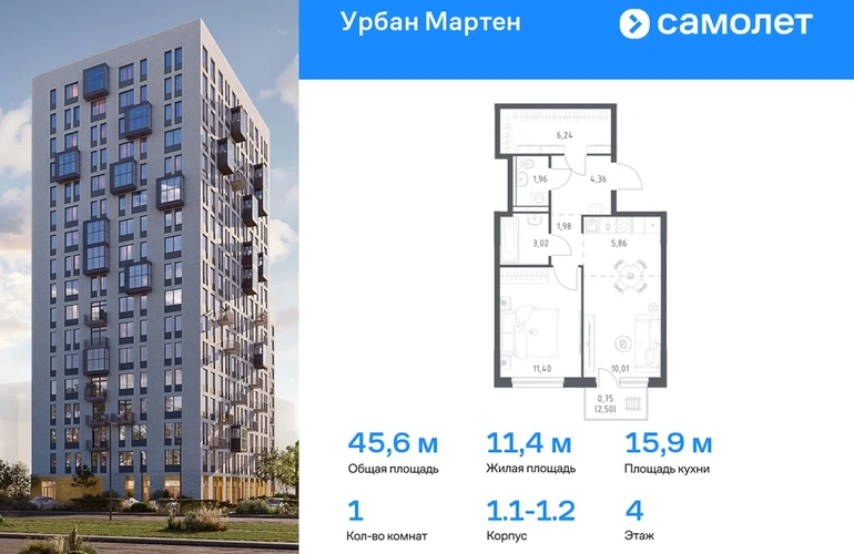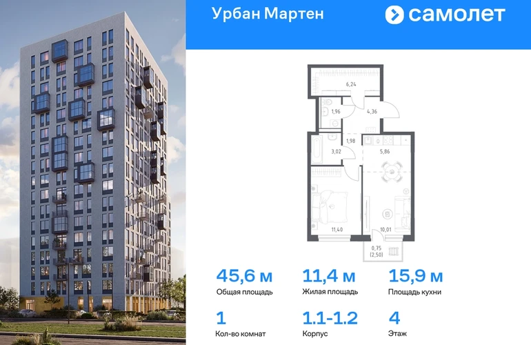 Строим кварталы для жизни с заботой о будущем. Предлагается 1-комнатная квартира комфорт-класса 45,5 кв.м в корпусе 1.1-1.2 на 4 этаже, в ЖК «Урбан Мартен» Квартира с чистовой отделкой. Доступность дополнительных опций уточняйте у застройщика. Приобрести квартиру возможно по специальным акциям от застройщика, с текущими условиями акций можно ознакомиться в блоке «Акций». Цена динамическая и может отличаться, уточняйте актуальность у застройщика. В жилом комплексе «Урбан Мартен» у вас будет собственная Уфа: домашняя, неторопливая, теплая. Здесь дети будут играть во дворе без машин в догонялки, собака сможет бегать за палкой по пляжу, а с соседями получится встречаться не только у лифта, но и на утренних занятиях йогой на зеленой лужайке рядом с домом. Жилой комплекс «Урбан Мартен» находится в Демском районе — самом тихом и зеленом в Уфе. Здесь можно открывать окна нараспашку, чтобы квартира наполнялась свежим воздухом, и наблюдать с балкона, как покачиваются макушки деревьев. #yan19-2r1758298#О застройщике