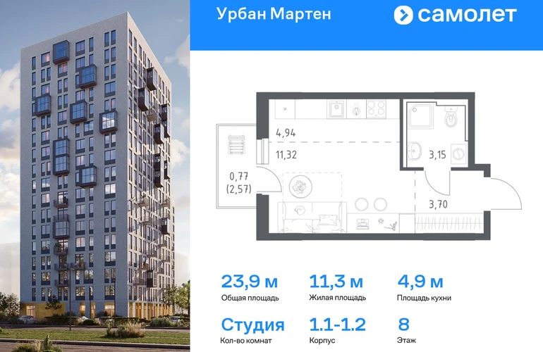 Строим кварталы для жизни с заботой о будущем. Предлагается квартира студия комфорт-класса 23,9 кв.м в корпусе 1.1-1.2 на 8 этаже, в ЖК «Урбан Мартен» Квартира с чистовой отделкой. Доступность дополнительных опций уточняйте у застройщика. Приобрести квартиру возможно по специальным акциям от застройщика, с текущими условиями акций можно ознакомиться в блоке «Акций». Цена динамическая и может отличаться, уточняйте актуальность у застройщика. В жилом комплексе «Урбан Мартен» у вас будет собственная Уфа: домашняя, неторопливая, теплая. Здесь дети будут играть во дворе без машин в догонялки, собака сможет бегать за палкой по пляжу, а с соседями получится встречаться не только у лифта, но и на утренних занятиях йогой на зеленой лужайке рядом с домом. Жилой комплекс «Урбан Мартен» находится в Демском районе — самом тихом и зеленом в Уфе. Здесь можно открывать окна нараспашку, чтобы квартира наполнялась свежим воздухом, и наблюдать с балкона, как покачиваются макушки деревьев. #yan19-2r1758306#О застройщике