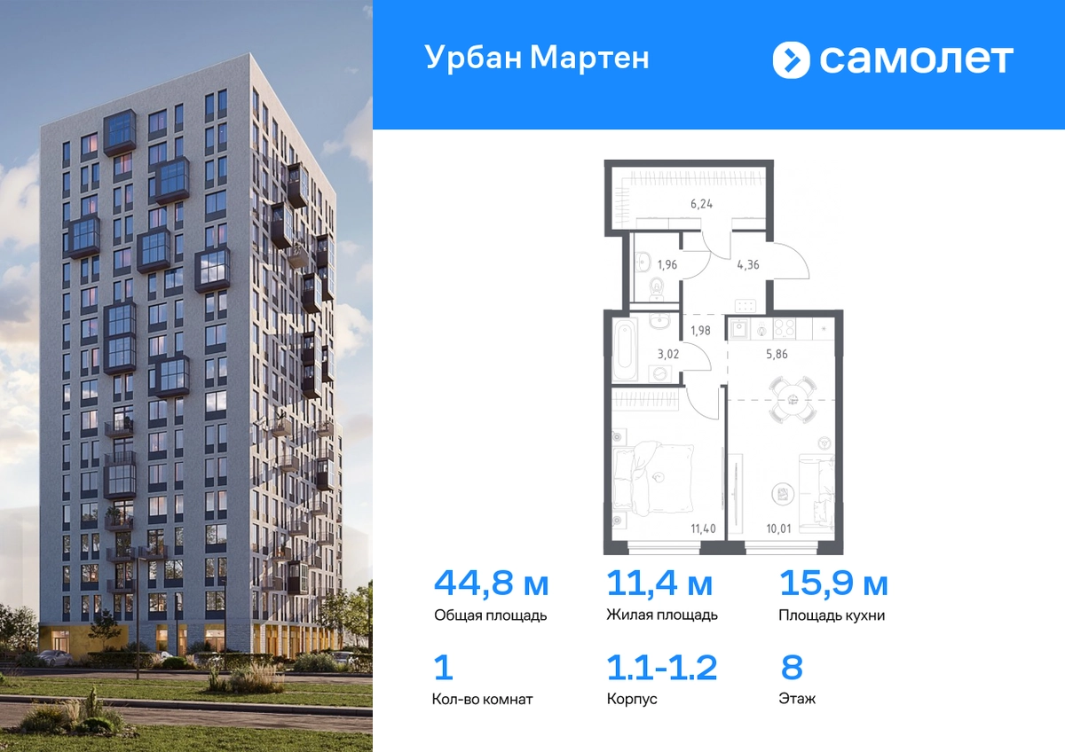 Предлагается 1-комнатная квартира комфорт-класса 44,83 кв.м в корпусе 1.1-1.2 на 8 этаже, в ЖК «Урбан Мартен» Квартира с чистовой отделкой. Доступность дополнительных опций уточняйте у застройщика. Приобрести квартиру возможно по специальным акциям от застройщика, с текущими условиями акций можно ознакомиться в блоке “Акций”. Цена динамическая и может отличаться, уточняйте актуальность у застройщика. В жилом комплексе «Урбан Мартен» у вас будет собственная Уфа: домашняя, неторопливая, теплая. Здесь дети будут играть во дворе без машин в догонялки, собака сможет бегать за палкой по пляжу, а с соседями получится встречаться не только у лифта, но и на утренних занятиях йогой на зеленой лужайке рядом с домом. Жилой комплекс «Урбан Мартен» находится в Демском районе — самом тихом и зеленом в Уфе. Здесь можно открывать окна нараспашку, чтобы квартира наполнялась свежим воздухом, и наблюдать с балкона, как покачиваются макушки деревьев. #yan19-2r1758313#О застройщике