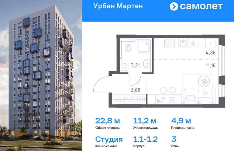 Строим кварталы для жизни с заботой о будущем. Предлагается квартира студия комфорт-класса 23,05 кв.м в корпусе 1.1-1.2 на 3 этаже, в ЖК «Урбан Мартен» Квартира с предчистовой отделкой. Доступность дополнительных опций уточняйте у застройщика. Приобрести квартиру возможно по специальным акциям от застройщика, с текущими условиями акций можно ознакомиться в блоке «Акций». Цена динамическая и может отличаться, уточняйте актуальность у застройщика. В жилом комплексе «Урбан Мартен» у вас будет собственная Уфа: домашняя, неторопливая, теплая. Здесь дети будут играть во дворе без машин в догонялки, собака сможет бегать за палкой по пляжу, а с соседями получится встречаться не только у лифта, но и на утренних занятиях йогой на зеленой лужайке рядом с домом. Жилой комплекс «Урбан Мартен» находится в Демском районе — самом тихом и зеленом в Уфе. Здесь можно открывать окна нараспашку, чтобы квартира наполнялась свежим воздухом, и наблюдать с балкона, как покачиваются макушки деревьев. #yan19-2r1758335#О застройщике