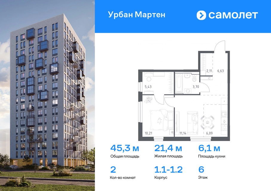 Строим кварталы для жизни с заботой о будущем. Предлагается 2-комнатная квартира комфорт-класса 45,42 кв.м в корпусе 1.1-1.2 на 6 этаже, в ЖК «Урбан Мартен» Квартира с предчистовой отделкой. Доступность дополнительных опций уточняйте у застройщика. Приобрести квартиру возможно по специальным акциям от застройщика, с текущими условиями акций можно ознакомиться в блоке «Акций». Цена динамическая и может отличаться, уточняйте актуальность у застройщика. В жилом комплексе «Урбан Мартен» у вас будет собственная Уфа: домашняя, неторопливая, теплая. Здесь дети будут играть во дворе без машин в догонялки, собака сможет бегать за палкой по пляжу, а с соседями получится встречаться не только у лифта, но и на утренних занятиях йогой на зеленой лужайке рядом с домом. Жилой комплекс «Урбан Мартен» находится в Демском районе — самом тихом и зеленом в Уфе. Здесь можно открывать окна нараспашку, чтобы квартира наполнялась свежим воздухом, и наблюдать с балкона, как покачиваются макушки деревьев. #yan19-2r1758336#О застройщике