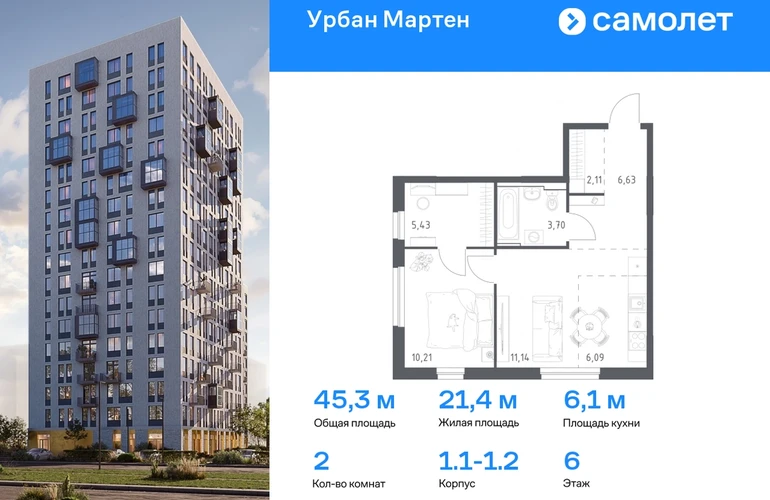 Строим кварталы для жизни с заботой о будущем. Предлагается 2-комнатная квартира комфорт-класса 45,42 кв.м в корпусе 1.1-1.2 на 6 этаже, в ЖК «Урбан Мартен» Квартира с предчистовой отделкой. Доступность дополнительных опций уточняйте у застройщика. Приобрести квартиру возможно по специальным акциям от застройщика, с текущими условиями акций можно ознакомиться в блоке «Акций». Цена динамическая и может отличаться, уточняйте актуальность у застройщика. В жилом комплексе «Урбан Мартен» у вас будет собственная Уфа: домашняя, неторопливая, теплая. Здесь дети будут играть во дворе без машин в догонялки, собака сможет бегать за палкой по пляжу, а с соседями получится встречаться не только у лифта, но и на утренних занятиях йогой на зеленой лужайке рядом с домом. Жилой комплекс «Урбан Мартен» находится в Демском районе — самом тихом и зеленом в Уфе. Здесь можно открывать окна нараспашку, чтобы квартира наполнялась свежим воздухом, и наблюдать с балкона, как покачиваются макушки деревьев. #yan19-2r1758336#О застройщике
