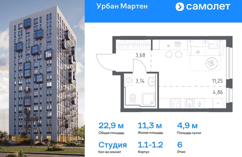 Предлагается квартира студия комфорт-класса 22,93 кв.м в корпусе 1.1-1.2 на 6 этаже, в ЖК «Урбан Мартен» Квартира с предчистовой отделкой. Доступность дополнительных опций уточняйте у застройщика. Приобрести квартиру возможно по специальным акциям от застройщика, с текущими условиями акций можно ознакомиться в блоке “Акций”. Цена динамическая и может отличаться, уточняйте актуальность у застройщика. В жилом комплексе «Урбан Мартен» у вас будет собственная Уфа: домашняя, неторопливая, теплая. Здесь дети будут играть во дворе без машин в догонялки, собака сможет бегать за палкой по пляжу, а с соседями получится встречаться не только у лифта, но и на утренних занятиях йогой на зеленой лужайке рядом с домом. Жилой комплекс «Урбан Мартен» находится в Демском районе — самом тихом и зеленом в Уфе. Здесь можно открывать окна нараспашку, чтобы квартира наполнялась свежим воздухом, и наблюдать с балкона, как покачиваются макушки деревьев. #yan19-2r1758345#О застройщике