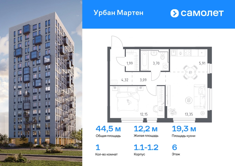 Предлагается 1-комнатная квартира комфорт-класса 44,51 кв.м в корпусе 1.1-1.2 на 6 этаже, в ЖК «Урбан Мартен» Квартира с предчистовой отделкой. Доступность дополнительных опций уточняйте у застройщика. Приобрести квартиру возможно по специальным акциям от застройщика, с текущими условиями акций можно ознакомиться в блоке “Акций”. Цена динамическая и может отличаться, уточняйте актуальность у застройщика. В жилом комплексе «Урбан Мартен» у вас будет собственная Уфа: домашняя, неторопливая, теплая. Здесь дети будут играть во дворе без машин в догонялки, собака сможет бегать за палкой по пляжу, а с соседями получится встречаться не только у лифта, но и на утренних занятиях йогой на зеленой лужайке рядом с домом. Жилой комплекс «Урбан Мартен» находится в Демском районе — самом тихом и зеленом в Уфе. Здесь можно открывать окна нараспашку, чтобы квартира наполнялась свежим воздухом, и наблюдать с балкона, как покачиваются макушки деревьев. #yan19-2r1758346#О застройщике