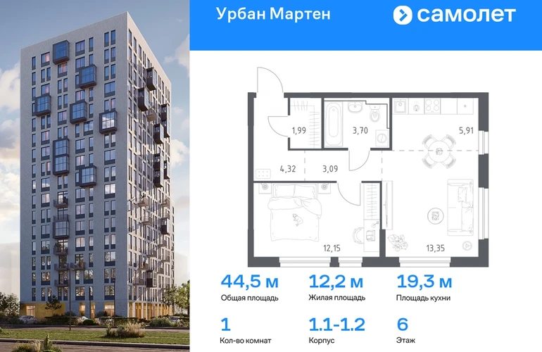 Предлагается 1-комнатная квартира комфорт-класса 44,51 кв.м в корпусе 1.1-1.2 на 6 этаже, в ЖК «Урбан Мартен» Квартира с предчистовой отделкой. Доступность дополнительных опций уточняйте у застройщика. Приобрести квартиру возможно по специальным акциям от застройщика, с текущими условиями акций можно ознакомиться в блоке “Акций”. Цена динамическая и может отличаться, уточняйте актуальность у застройщика. В жилом комплексе «Урбан Мартен» у вас будет собственная Уфа: домашняя, неторопливая, теплая. Здесь дети будут играть во дворе без машин в догонялки, собака сможет бегать за палкой по пляжу, а с соседями получится встречаться не только у лифта, но и на утренних занятиях йогой на зеленой лужайке рядом с домом. Жилой комплекс «Урбан Мартен» находится в Демском районе — самом тихом и зеленом в Уфе. Здесь можно открывать окна нараспашку, чтобы квартира наполнялась свежим воздухом, и наблюдать с балкона, как покачиваются макушки деревьев. #yan19-2r1758346#О застройщике