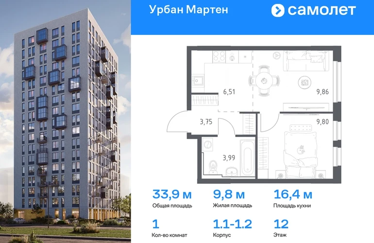 Предлагается 1-комнатная квартира комфорт-класса 33,91 кв.м в корпусе 1.1-1.2 на 12 этаже, в ЖК «Урбан Мартен» Квартира с предчистовой отделкой. Доступность дополнительных опций уточняйте у застройщика. Приобрести квартиру возможно по специальным акциям от застройщика, с текущими условиями акций можно ознакомиться в блоке “Акций”. Цена динамическая и может отличаться, уточняйте актуальность у застройщика. В жилом комплексе «Урбан Мартен» у вас будет собственная Уфа: домашняя, неторопливая, теплая. Здесь дети будут играть во дворе без машин в догонялки, собака сможет бегать за палкой по пляжу, а с соседями получится встречаться не только у лифта, но и на утренних занятиях йогой на зеленой лужайке рядом с домом. Жилой комплекс «Урбан Мартен» находится в Демском районе — самом тихом и зеленом в Уфе. Здесь можно открывать окна нараспашку, чтобы квартира наполнялась свежим воздухом, и наблюдать с балкона, как покачиваются макушки деревьев. #yan19-2r1758351#О застройщике