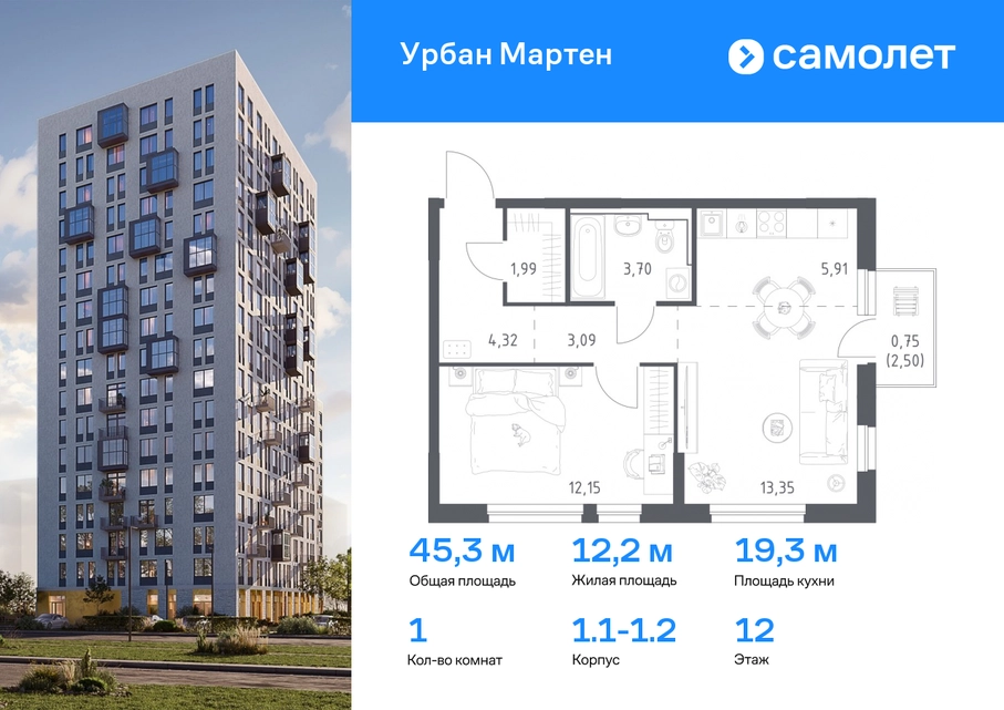 Строим кварталы для жизни с заботой о будущем. Предлагается 1-комнатная квартира комфорт-класса 45,59 кв.м в корпусе 1.1-1.2 на 12 этаже, в ЖК «Урбан Мартен» Квартира с предчистовой отделкой. Доступность дополнительных опций уточняйте у застройщика. Приобрести квартиру возможно по специальным акциям от застройщика, с текущими условиями акций можно ознакомиться в блоке «Акций». Цена динамическая и может отличаться, уточняйте актуальность у застройщика. В жилом комплексе «Урбан Мартен» у вас будет собственная Уфа: домашняя, неторопливая, теплая. Здесь дети будут играть во дворе без машин в догонялки, собака сможет бегать за палкой по пляжу, а с соседями получится встречаться не только у лифта, но и на утренних занятиях йогой на зеленой лужайке рядом с домом. Жилой комплекс «Урбан Мартен» находится в Демском районе — самом тихом и зеленом в Уфе. Здесь можно открывать окна нараспашку, чтобы квартира наполнялась свежим воздухом, и наблюдать с балкона, как покачиваются макушки деревьев. #yan19-2r1758356#О застройщике