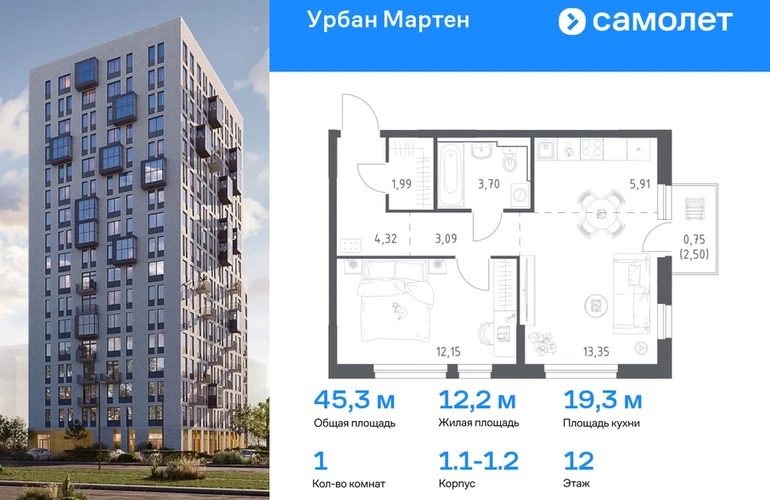 Строим кварталы для жизни с заботой о будущем. Предлагается 1-комнатная квартира комфорт-класса 45,59 кв.м в корпусе 1.1-1.2 на 12 этаже, в ЖК «Урбан Мартен» Квартира с предчистовой отделкой. Доступность дополнительных опций уточняйте у застройщика. Приобрести квартиру возможно по специальным акциям от застройщика, с текущими условиями акций можно ознакомиться в блоке «Акций». Цена динамическая и может отличаться, уточняйте актуальность у застройщика. В жилом комплексе «Урбан Мартен» у вас будет собственная Уфа: домашняя, неторопливая, теплая. Здесь дети будут играть во дворе без машин в догонялки, собака сможет бегать за палкой по пляжу, а с соседями получится встречаться не только у лифта, но и на утренних занятиях йогой на зеленой лужайке рядом с домом. Жилой комплекс «Урбан Мартен» находится в Демском районе — самом тихом и зеленом в Уфе. Здесь можно открывать окна нараспашку, чтобы квартира наполнялась свежим воздухом, и наблюдать с балкона, как покачиваются макушки деревьев. #yan19-2r1758356#О застройщике