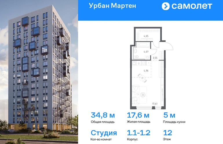 Строим кварталы для жизни с заботой о будущем. Предлагается квартира студия комфорт-класса 35 кв.м в корпусе 1.1-1.2 на 12 этаже, в ЖК «Урбан Мартен» Квартира с предчистовой отделкой. Доступность дополнительных опций уточняйте у застройщика. Приобрести квартиру возможно по специальным акциям от застройщика, с текущими условиями акций можно ознакомиться в блоке «Акций». Цена динамическая и может отличаться, уточняйте актуальность у застройщика. В жилом комплексе «Урбан Мартен» у вас будет собственная Уфа: домашняя, неторопливая, теплая. Здесь дети будут играть во дворе без машин в догонялки, собака сможет бегать за палкой по пляжу, а с соседями получится встречаться не только у лифта, но и на утренних занятиях йогой на зеленой лужайке рядом с домом. Жилой комплекс «Урбан Мартен» находится в Демском районе — самом тихом и зеленом в Уфе. Здесь можно открывать окна нараспашку, чтобы квартира наполнялась свежим воздухом, и наблюдать с балкона, как покачиваются макушки деревьев. #yan19-2r1758357#О застройщике