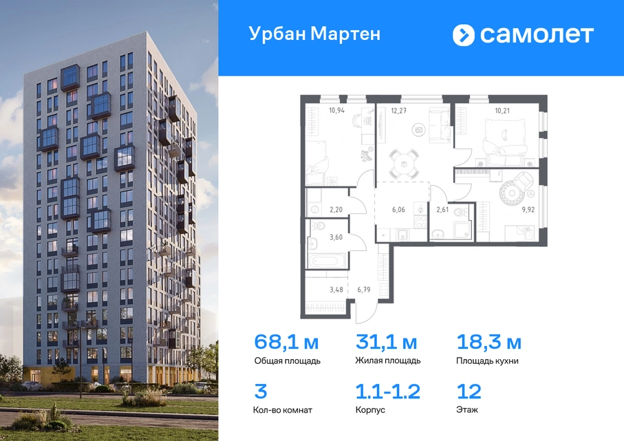 Строим кварталы для жизни с заботой о будущем. Предлагается 3-комнатная квартира комфорт-класса 68,96 кв.м в корпусе 1.1-1.2 на 12 этаже, в ЖК «Урбан Мартен» Квартира с предчистовой отделкой. Доступность дополнительных опций уточняйте у застройщика. Приобрести квартиру возможно по специальным акциям от застройщика, с текущими условиями акций можно ознакомиться в блоке «Акций». Цена динамическая и может отличаться, уточняйте актуальность у застройщика. В жилом комплексе «Урбан Мартен» у вас будет собственная Уфа: домашняя, неторопливая, теплая. Здесь дети будут играть во дворе без машин в догонялки, собака сможет бегать за палкой по пляжу, а с соседями получится встречаться не только у лифта, но и на утренних занятиях йогой на зеленой лужайке рядом с домом. Жилой комплекс «Урбан Мартен» находится в Демском районе — самом тихом и зеленом в Уфе. Здесь можно открывать окна нараспашку, чтобы квартира наполнялась свежим воздухом, и наблюдать с балкона, как покачиваются макушки деревьев. #yan19-2r1758359#О застройщике