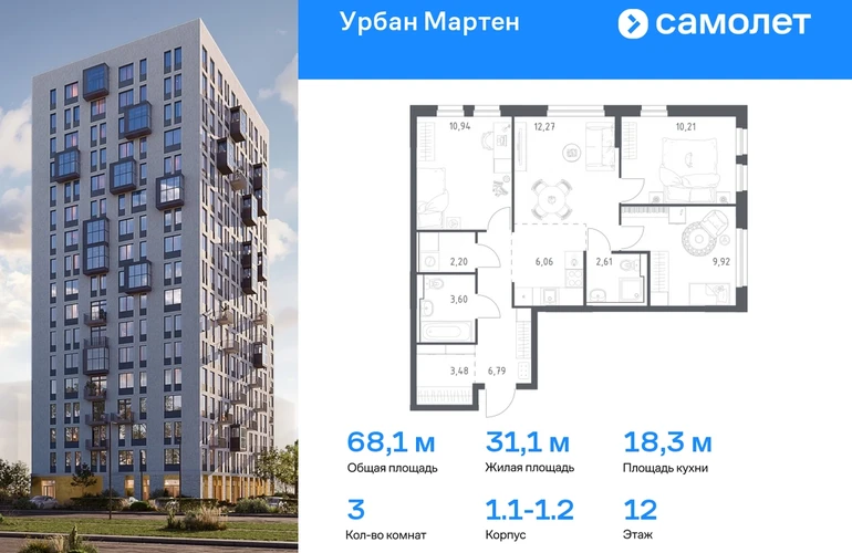 Строим кварталы для жизни с заботой о будущем. Предлагается 3-комнатная квартира комфорт-класса 68,96 кв.м в корпусе 1.1-1.2 на 12 этаже, в ЖК «Урбан Мартен» Квартира с предчистовой отделкой. Доступность дополнительных опций уточняйте у застройщика. Приобрести квартиру возможно по специальным акциям от застройщика, с текущими условиями акций можно ознакомиться в блоке «Акций». Цена динамическая и может отличаться, уточняйте актуальность у застройщика. В жилом комплексе «Урбан Мартен» у вас будет собственная Уфа: домашняя, неторопливая, теплая. Здесь дети будут играть во дворе без машин в догонялки, собака сможет бегать за палкой по пляжу, а с соседями получится встречаться не только у лифта, но и на утренних занятиях йогой на зеленой лужайке рядом с домом. Жилой комплекс «Урбан Мартен» находится в Демском районе — самом тихом и зеленом в Уфе. Здесь можно открывать окна нараспашку, чтобы квартира наполнялась свежим воздухом, и наблюдать с балкона, как покачиваются макушки деревьев. #yan19-2r1758359#О застройщике