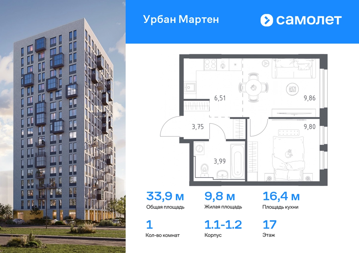 Предлагается 1-комнатная квартира комфорт-класса 33,91 кв.м в корпусе 1.1-1.2 на 17 этаже, в ЖК «Урбан Мартен» Квартира с предчистовой отделкой. Доступность дополнительных опций уточняйте у застройщика. Приобрести квартиру возможно по специальным акциям от застройщика, с текущими условиями акций можно ознакомиться в блоке “Акций”. Цена динамическая и может отличаться, уточняйте актуальность у застройщика. В жилом комплексе «Урбан Мартен» у вас будет собственная Уфа: домашняя, неторопливая, теплая. Здесь дети будут играть во дворе без машин в догонялки, собака сможет бегать за палкой по пляжу, а с соседями получится встречаться не только у лифта, но и на утренних занятиях йогой на зеленой лужайке рядом с домом. Жилой комплекс «Урбан Мартен» находится в Демском районе — самом тихом и зеленом в Уфе. Здесь можно открывать окна нараспашку, чтобы квартира наполнялась свежим воздухом, и наблюдать с балкона, как покачиваются макушки деревьев. #yan19-2r1758365#О застройщике