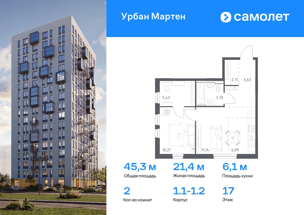 Предлагается 2-комнатная квартира комфорт-класса 45,31 кв.м в корпусе 1.1-1.2 на 17 этаже, в ЖК «Урбан Мартен» Квартира с предчистовой отделкой. Доступность дополнительных опций уточняйте у застройщика. Приобрести квартиру возможно по специальным акциям от застройщика, с текущими условиями акций можно ознакомиться в блоке “Акций”. Цена динамическая и может отличаться, уточняйте актуальность у застройщика. В жилом комплексе «Урбан Мартен» у вас будет собственная Уфа: домашняя, неторопливая, теплая. Здесь дети будут играть во дворе без машин в догонялки, собака сможет бегать за палкой по пляжу, а с соседями получится встречаться не только у лифта, но и на утренних занятиях йогой на зеленой лужайке рядом с домом. Жилой комплекс «Урбан Мартен» находится в Демском районе — самом тихом и зеленом в Уфе. Здесь можно открывать окна нараспашку, чтобы квартира наполнялась свежим воздухом, и наблюдать с балкона, как покачиваются макушки деревьев. #yan19-2r1758368#О застройщике
