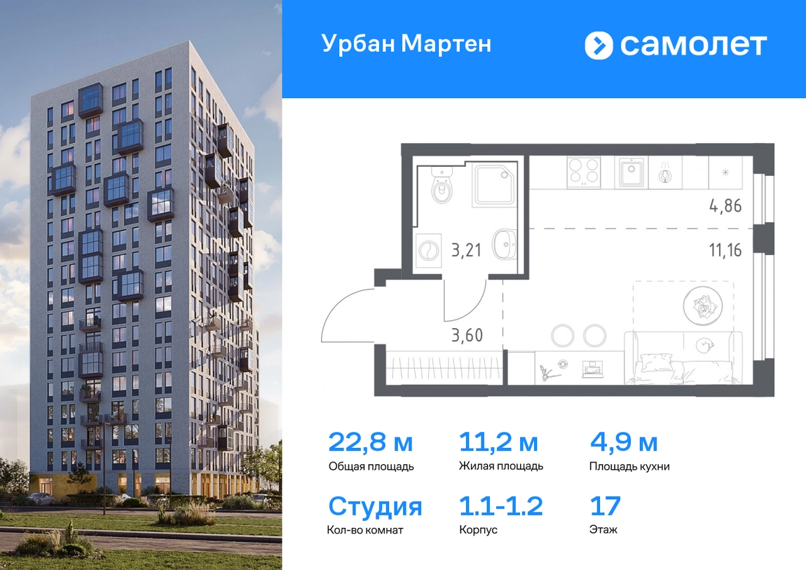 Строим кварталы для жизни с заботой о будущем. Предлагается квартира студия комфорт-класса 23,05 кв.м в корпусе 1.1-1.2 на 17 этаже, в ЖК «Урбан Мартен» Квартира с предчистовой отделкой. Доступность дополнительных опций уточняйте у застройщика. Приобрести квартиру возможно по специальным акциям от застройщика, с текущими условиями акций можно ознакомиться в блоке «Акций». Цена динамическая и может отличаться, уточняйте актуальность у застройщика. В жилом комплексе «Урбан Мартен» у вас будет собственная Уфа: домашняя, неторопливая, теплая. Здесь дети будут играть во дворе без машин в догонялки, собака сможет бегать за палкой по пляжу, а с соседями получится встречаться не только у лифта, но и на утренних занятиях йогой на зеленой лужайке рядом с домом. Жилой комплекс «Урбан Мартен» находится в Демском районе — самом тихом и зеленом в Уфе. Здесь можно открывать окна нараспашку, чтобы квартира наполнялась свежим воздухом, и наблюдать с балкона, как покачиваются макушки деревьев. #yan19-2r1758371#О застройщике