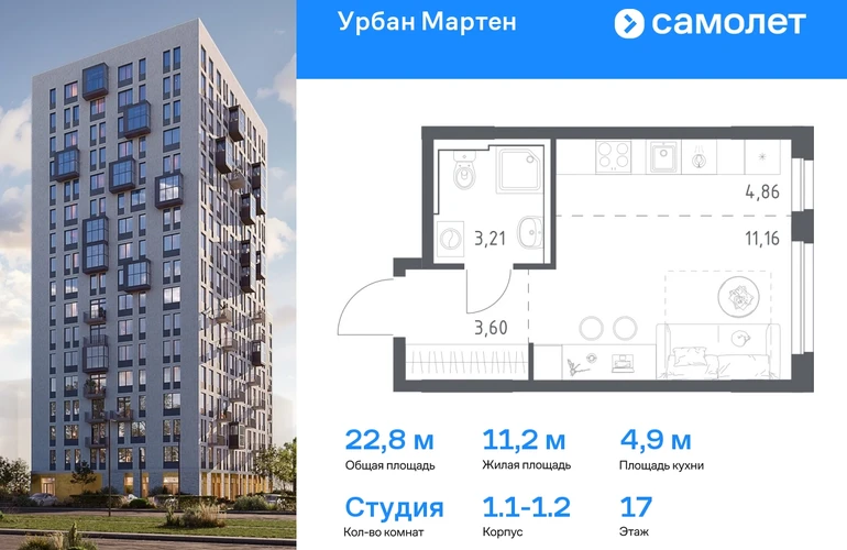 Строим кварталы для жизни с заботой о будущем. Предлагается квартира студия комфорт-класса 23,05 кв.м в корпусе 1.1-1.2 на 17 этаже, в ЖК «Урбан Мартен» Квартира с предчистовой отделкой. Доступность дополнительных опций уточняйте у застройщика. Приобрести квартиру возможно по специальным акциям от застройщика, с текущими условиями акций можно ознакомиться в блоке «Акций». Цена динамическая и может отличаться, уточняйте актуальность у застройщика. В жилом комплексе «Урбан Мартен» у вас будет собственная Уфа: домашняя, неторопливая, теплая. Здесь дети будут играть во дворе без машин в догонялки, собака сможет бегать за палкой по пляжу, а с соседями получится встречаться не только у лифта, но и на утренних занятиях йогой на зеленой лужайке рядом с домом. Жилой комплекс «Урбан Мартен» находится в Демском районе — самом тихом и зеленом в Уфе. Здесь можно открывать окна нараспашку, чтобы квартира наполнялась свежим воздухом, и наблюдать с балкона, как покачиваются макушки деревьев. #yan19-2r1758371#О застройщике
