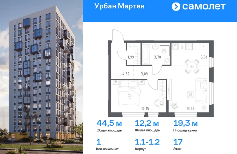 Строим кварталы для жизни с заботой о будущем. Предлагается 1-комнатная квартира комфорт-класса 44,85 кв.м в корпусе 1.1-1.2 на 17 этаже, в ЖК «Урбан Мартен» Квартира с предчистовой отделкой. Доступность дополнительных опций уточняйте у застройщика. Приобрести квартиру возможно по специальным акциям от застройщика, с текущими условиями акций можно ознакомиться в блоке «Акций». Цена динамическая и может отличаться, уточняйте актуальность у застройщика. В жилом комплексе «Урбан Мартен» у вас будет собственная Уфа: домашняя, неторопливая, теплая. Здесь дети будут играть во дворе без машин в догонялки, собака сможет бегать за палкой по пляжу, а с соседями получится встречаться не только у лифта, но и на утренних занятиях йогой на зеленой лужайке рядом с домом. Жилой комплекс «Урбан Мартен» находится в Демском районе — самом тихом и зеленом в Уфе. Здесь можно открывать окна нараспашку, чтобы квартира наполнялась свежим воздухом, и наблюдать с балкона, как покачиваются макушки деревьев. #yan19-2r1758373#О застройщике