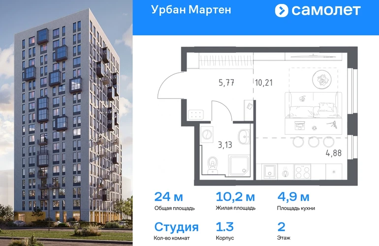 Строим кварталы для жизни с заботой о будущем. Предлагается квартира студия комфорт-класса 24,17 кв.м в корпусе 1.3 на 2 этаже, в ЖК «Урбан Мартен» Квартира с предчистовой отделкой. Доступность дополнительных опций уточняйте у застройщика. Приобрести квартиру возможно по специальным акциям от застройщика, с текущими условиями акций можно ознакомиться в блоке «Акций». Цена динамическая и может отличаться, уточняйте актуальность у застройщика. В жилом комплексе «Урбан Мартен» у вас будет собственная Уфа: домашняя, неторопливая, теплая. Здесь дети будут играть во дворе без машин в догонялки, собака сможет бегать за палкой по пляжу, а с соседями получится встречаться не только у лифта, но и на утренних занятиях йогой на зеленой лужайке рядом с домом. Жилой комплекс «Урбан Мартен» находится в Демском районе — самом тихом и зеленом в Уфе. Здесь можно открывать окна нараспашку, чтобы квартира наполнялась свежим воздухом, и наблюдать с балкона, как покачиваются макушки деревьев. #yan19-2r1758375#О застройщике