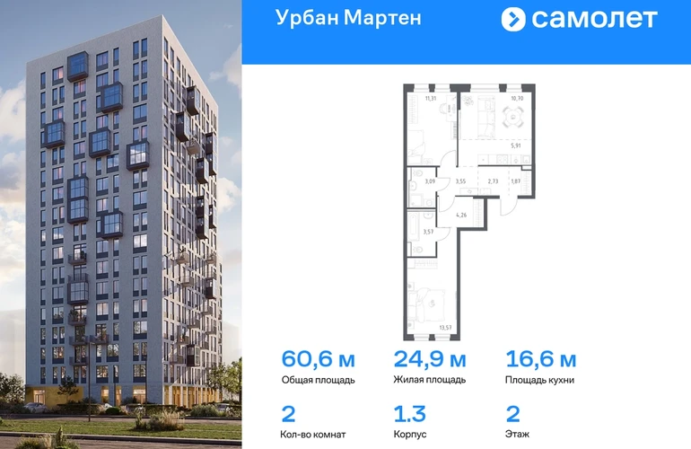 Строим кварталы для жизни с заботой о будущем. Предлагается 2-комнатная квартира комфорт-класса 60,93 кв.м в корпусе 1.3 на 2 этаже, в ЖК «Урбан Мартен» Квартира с предчистовой отделкой. Доступность дополнительных опций уточняйте у застройщика. Приобрести квартиру возможно по специальным акциям от застройщика, с текущими условиями акций можно ознакомиться в блоке «Акций». Цена динамическая и может отличаться, уточняйте актуальность у застройщика. В жилом комплексе «Урбан Мартен» у вас будет собственная Уфа: домашняя, неторопливая, теплая. Здесь дети будут играть во дворе без машин в догонялки, собака сможет бегать за палкой по пляжу, а с соседями получится встречаться не только у лифта, но и на утренних занятиях йогой на зеленой лужайке рядом с домом. Жилой комплекс «Урбан Мартен» находится в Демском районе — самом тихом и зеленом в Уфе. Здесь можно открывать окна нараспашку, чтобы квартира наполнялась свежим воздухом, и наблюдать с балкона, как покачиваются макушки деревьев. #yan19-2r1758377#О застройщике