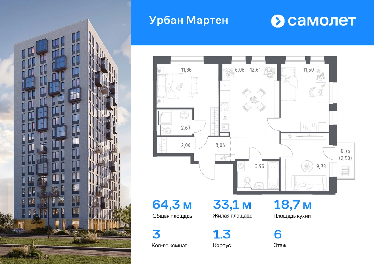 Строим кварталы для жизни с заботой о будущем. Предлагается 3-комнатная квартира комфорт-класса 64,53 кв.м в корпусе 1.3 на 6 этаже, в ЖК «Урбан Мартен» Квартира с предчистовой отделкой. Доступность дополнительных опций уточняйте у застройщика. Приобрести квартиру возможно по специальным акциям от застройщика, с текущими условиями акций можно ознакомиться в блоке «Акций». Цена динамическая и может отличаться, уточняйте актуальность у застройщика. В жилом комплексе «Урбан Мартен» у вас будет собственная Уфа: домашняя, неторопливая, теплая. Здесь дети будут играть во дворе без машин в догонялки, собака сможет бегать за палкой по пляжу, а с соседями получится встречаться не только у лифта, но и на утренних занятиях йогой на зеленой лужайке рядом с домом. Жилой комплекс «Урбан Мартен» находится в Демском районе — самом тихом и зеленом в Уфе. Здесь можно открывать окна нараспашку, чтобы квартира наполнялась свежим воздухом, и наблюдать с балкона, как покачиваются макушки деревьев. #yan19-2r1758395#О застройщике