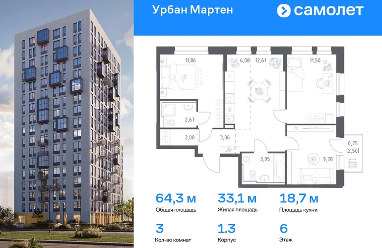 Строим кварталы для жизни с заботой о будущем. Предлагается 3-комнатная квартира комфорт-класса 64,53 кв.м в корпусе 1.3 на 6 этаже, в ЖК «Урбан Мартен» Квартира с предчистовой отделкой. Доступность дополнительных опций уточняйте у застройщика. Приобрести квартиру возможно по специальным акциям от застройщика, с текущими условиями акций можно ознакомиться в блоке «Акций». Цена динамическая и может отличаться, уточняйте актуальность у застройщика. В жилом комплексе «Урбан Мартен» у вас будет собственная Уфа: домашняя, неторопливая, теплая. Здесь дети будут играть во дворе без машин в догонялки, собака сможет бегать за палкой по пляжу, а с соседями получится встречаться не только у лифта, но и на утренних занятиях йогой на зеленой лужайке рядом с домом. Жилой комплекс «Урбан Мартен» находится в Демском районе — самом тихом и зеленом в Уфе. Здесь можно открывать окна нараспашку, чтобы квартира наполнялась свежим воздухом, и наблюдать с балкона, как покачиваются макушки деревьев. #yan19-2r1758395#О застройщике
