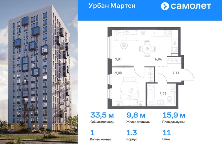 Предлагается 1-комнатная квартира комфорт-класса 33,47 кв.м в корпусе 1.3 на 11 этаже, в ЖК «Урбан Мартен» Квартира с предчистовой отделкой. Доступность дополнительных опций уточняйте у застройщика. Приобрести квартиру возможно по специальным акциям от застройщика, с текущими условиями акций можно ознакомиться в блоке “Акций”. Цена динамическая и может отличаться, уточняйте актуальность у застройщика. В жилом комплексе «Урбан Мартен» у вас будет собственная Уфа: домашняя, неторопливая, теплая. Здесь дети будут играть во дворе без машин в догонялки, собака сможет бегать за палкой по пляжу, а с соседями получится встречаться не только у лифта, но и на утренних занятиях йогой на зеленой лужайке рядом с домом. Жилой комплекс «Урбан Мартен» находится в Демском районе — самом тихом и зеленом в Уфе. Здесь можно открывать окна нараспашку, чтобы квартира наполнялась свежим воздухом, и наблюдать с балкона, как покачиваются макушки деревьев. #yan19-2r1758404#О застройщике
