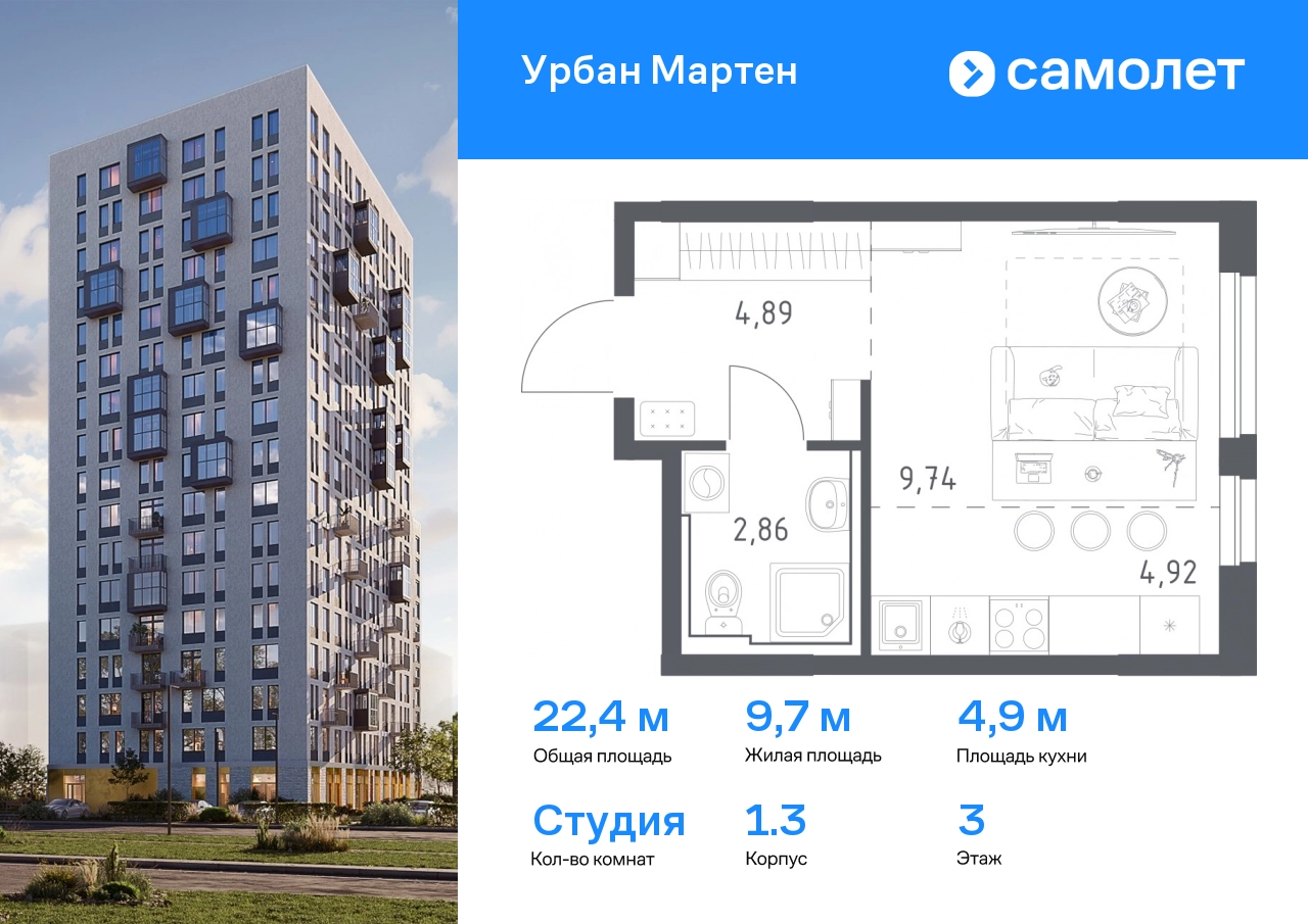 Предлагается квартира студия комфорт-класса 22,41 кв.м в корпусе 1.3 на 3 этаже, в ЖК «Урбан Мартен» Квартира с предчистовой отделкой. Доступность дополнительных опций уточняйте у застройщика. Приобрести квартиру возможно по специальным акциям от застройщика, с текущими условиями акций можно ознакомиться в блоке “Акций”. Цена динамическая и может отличаться, уточняйте актуальность у застройщика. В жилом комплексе «Урбан Мартен» у вас будет собственная Уфа: домашняя, неторопливая, теплая. Здесь дети будут играть во дворе без машин в догонялки, собака сможет бегать за палкой по пляжу, а с соседями получится встречаться не только у лифта, но и на утренних занятиях йогой на зеленой лужайке рядом с домом. Жилой комплекс «Урбан Мартен» находится в Демском районе — самом тихом и зеленом в Уфе. Здесь можно открывать окна нараспашку, чтобы квартира наполнялась свежим воздухом, и наблюдать с балкона, как покачиваются макушки деревьев. #yan19-2r1758411#О застройщике