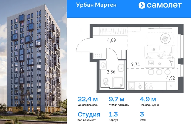 Предлагается квартира студия комфорт-класса 22,41 кв.м в корпусе 1.3 на 3 этаже, в ЖК «Урбан Мартен» Квартира с предчистовой отделкой. Доступность дополнительных опций уточняйте у застройщика. Приобрести квартиру возможно по специальным акциям от застройщика, с текущими условиями акций можно ознакомиться в блоке “Акций”. Цена динамическая и может отличаться, уточняйте актуальность у застройщика. В жилом комплексе «Урбан Мартен» у вас будет собственная Уфа: домашняя, неторопливая, теплая. Здесь дети будут играть во дворе без машин в догонялки, собака сможет бегать за палкой по пляжу, а с соседями получится встречаться не только у лифта, но и на утренних занятиях йогой на зеленой лужайке рядом с домом. Жилой комплекс «Урбан Мартен» находится в Демском районе — самом тихом и зеленом в Уфе. Здесь можно открывать окна нараспашку, чтобы квартира наполнялась свежим воздухом, и наблюдать с балкона, как покачиваются макушки деревьев. #yan19-2r1758411#О застройщике