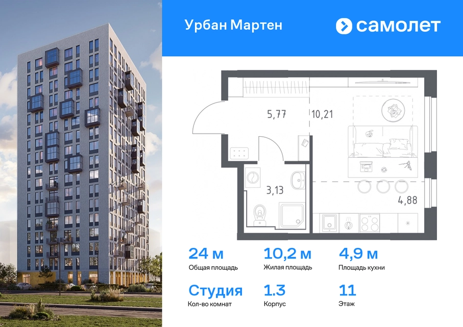 Предлагается квартира студия комфорт-класса 23,99 кв.м в корпусе 1.3 на 11 этаже, в ЖК «Урбан Мартен» Квартира с предчистовой отделкой. Доступность дополнительных опций уточняйте у застройщика. Приобрести квартиру возможно по специальным акциям от застройщика, с текущими условиями акций можно ознакомиться в блоке “Акций”. Цена динамическая и может отличаться, уточняйте актуальность у застройщика. В жилом комплексе «Урбан Мартен» у вас будет собственная Уфа: домашняя, неторопливая, теплая. Здесь дети будут играть во дворе без машин в догонялки, собака сможет бегать за палкой по пляжу, а с соседями получится встречаться не только у лифта, но и на утренних занятиях йогой на зеленой лужайке рядом с домом. Жилой комплекс «Урбан Мартен» находится в Демском районе — самом тихом и зеленом в Уфе. Здесь можно открывать окна нараспашку, чтобы квартира наполнялась свежим воздухом, и наблюдать с балкона, как покачиваются макушки деревьев. #yan19-2r1758420#О застройщике