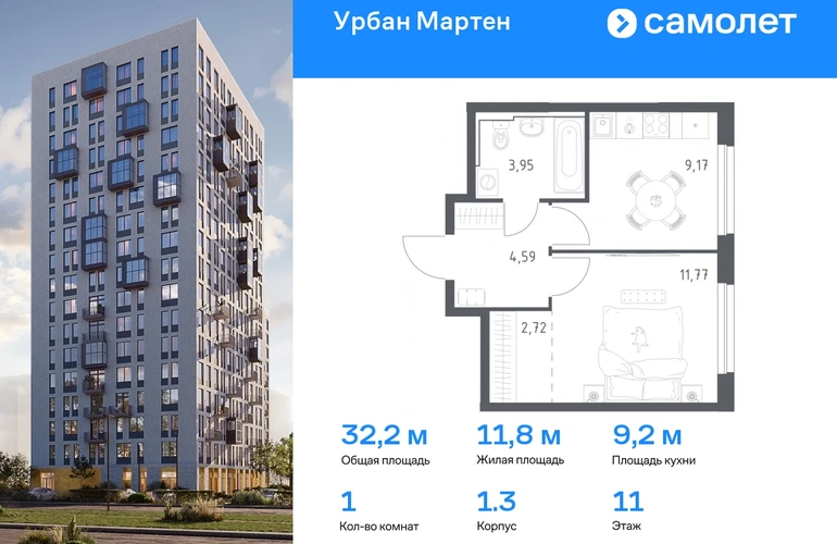 Предлагается 1-комнатная квартира комфорт-класса 32,2 кв.м в корпусе 1.3 на 11 этаже, в ЖК «Урбан Мартен» Квартира с предчистовой отделкой. Доступность дополнительных опций уточняйте у застройщика. Приобрести квартиру возможно по специальным акциям от застройщика, с текущими условиями акций можно ознакомиться в блоке “Акций”. Цена динамическая и может отличаться, уточняйте актуальность у застройщика. В жилом комплексе «Урбан Мартен» у вас будет собственная Уфа: домашняя, неторопливая, теплая. Здесь дети будут играть во дворе без машин в догонялки, собака сможет бегать за палкой по пляжу, а с соседями получится встречаться не только у лифта, но и на утренних занятиях йогой на зеленой лужайке рядом с домом. Жилой комплекс «Урбан Мартен» находится в Демском районе — самом тихом и зеленом в Уфе. Здесь можно открывать окна нараспашку, чтобы квартира наполнялась свежим воздухом, и наблюдать с балкона, как покачиваются макушки деревьев. #yan19-2r1758438#О застройщике
