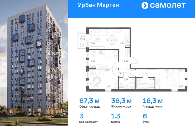 Строим кварталы для жизни с заботой о будущем. Предлагается 3-комнатная квартира комфорт-класса 67,47 кв.м в корпусе 1.3 на 6 этаже, в ЖК «Урбан Мартен» Квартира с предчистовой отделкой. Доступность дополнительных опций уточняйте у застройщика. Приобрести квартиру возможно по специальным акциям от застройщика, с текущими условиями акций можно ознакомиться в блоке «Акций». Цена динамическая и может отличаться, уточняйте актуальность у застройщика. В жилом комплексе «Урбан Мартен» у вас будет собственная Уфа: домашняя, неторопливая, теплая. Здесь дети будут играть во дворе без машин в догонялки, собака сможет бегать за палкой по пляжу, а с соседями получится встречаться не только у лифта, но и на утренних занятиях йогой на зеленой лужайке рядом с домом. Жилой комплекс «Урбан Мартен» находится в Демском районе — самом тихом и зеленом в Уфе. Здесь можно открывать окна нараспашку, чтобы квартира наполнялась свежим воздухом, и наблюдать с балкона, как покачиваются макушки деревьев. #yan19-2r1758440#О застройщике