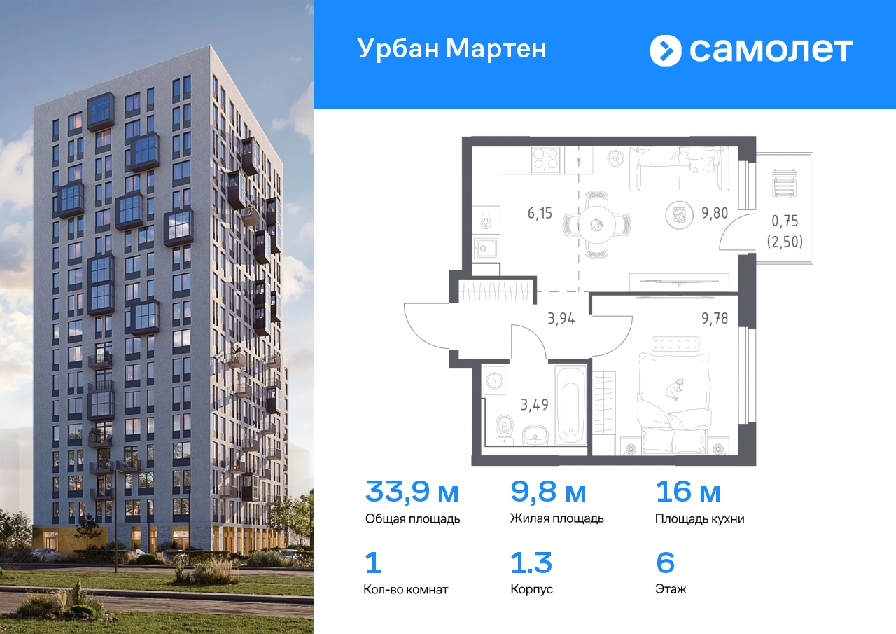Предлагается 1-комнатная квартира комфорт-класса 33,91 кв.м в корпусе 1.3 на 6 этаже, в ЖК "Урбан Мартен" Квартира с предчистовой отделкой. Доступность дополнительных опций уточняйте у застройщика. Планировкой предусмотрены: Прихожая - 3,94 м² Кухня-ниша - 6,15 м² Жилая_комната_1 - 9,8 м² Жилая_комната_2 - 9,78 м² Су_1 - 3,49 м² Балкон_1 - 0,75 м² Приобрести квартиру возможно по специальным акциям от застройщика, с текущими условиями акций можно ознакомиться в блоке “Акций”. Цена динамическая и может отличаться, уточняйте актуальность у застройщика. В жилом комплексе «Урбан Мартен» у вас будет собственная Уфа: домашняя, неторопливая, теплая. Здесь дети будут играть во дворе без машин в догонялки, собака сможет бегать за палкой по пляжу, а с соседями получится встречаться не только у лифта, но и на утренних занятиях йогой на зеленой лужайке рядом с домом. Жилой комплекс «Урбан Мартен» находится в Демском районе — самом тихом и зеленом в Уфе. Здесь можно открывать окна нараспашку, чтобы квартира наполнялась свежим воздухом, и наблюдать с балкона, как покачиваются макушки деревьев. #yan19-2r1758441#О застройщике