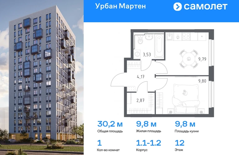 Предлагается 1-комнатная квартира комфорт-класса 30,16 кв.м в корпусе 1.1-1.2 на 12 этаже, в ЖК "Урбан Мартен" Квартира с чистовой отделкой. Доступность дополнительных опций уточняйте у застройщика. Планировкой предусмотрены: Кухня - 9,79 м² Жилая_комната_1 - 9,8 м² Су_1 - 3,53 м² Гардероб - 2,87 м² Прихожая - 4,17 м² Приобрести квартиру возможно по специальным акциям от застройщика, с текущими условиями акций можно ознакомиться в блоке “Акций”. Цена динамическая и может отличаться, уточняйте актуальность у застройщика. В жилом комплексе «Урбан Мартен» у вас будет собственная Уфа: домашняя, неторопливая, теплая. Здесь дети будут играть во дворе без машин в догонялки, собака сможет бегать за палкой по пляжу, а с соседями получится встречаться не только у лифта, но и на утренних занятиях йогой на зеленой лужайке рядом с домом. Жилой комплекс «Урбан Мартен» находится в Демском районе — самом тихом и зеленом в Уфе. Здесь можно открывать окна нараспашку, чтобы квартира наполнялась свежим воздухом, и наблюдать с балкона, как покачиваются макушки деревьев. #yan19-2r1758649#О застройщике