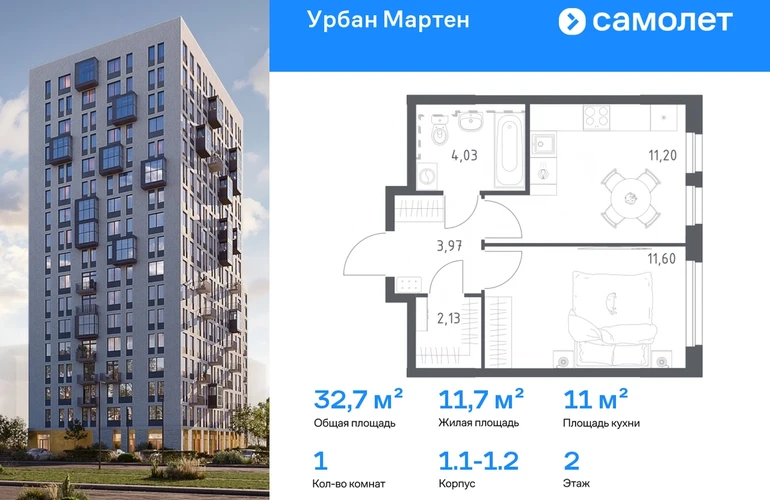 Строим кварталы для жизни с заботой о будущем. Предлагается 1-комнатная квартира комфорт-класса 32,93 кв.м в корпусе 1.1-1.2 на 2 этаже, в ЖК «Урбан Мартен» Квартира с предчистовой отделкой. Доступность дополнительных опций уточняйте у застройщика. Приобрести квартиру возможно по специальным акциям от застройщика, с текущими условиями акций можно ознакомиться в блоке «Акций». Цена динамическая и может отличаться, уточняйте актуальность у застройщика. В жилом комплексе «Урбан Мартен» у вас будет собственная Уфа: домашняя, неторопливая, теплая. Здесь дети будут играть во дворе без машин в догонялки, собака сможет бегать за палкой по пляжу, а с соседями получится встречаться не только у лифта, но и на утренних занятиях йогой на зеленой лужайке рядом с домом. Жилой комплекс «Урбан Мартен» находится в Демском районе — самом тихом и зеленом в Уфе. Здесь можно открывать окна нараспашку, чтобы квартира наполнялась свежим воздухом, и наблюдать с балкона, как покачиваются макушки деревьев. #yan19-2r1807989#О застройщике