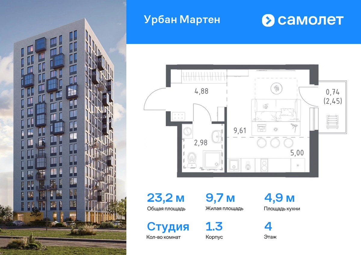 Строим кварталы для жизни с заботой о будущем. Предлагается квартира студия комфорт-класса 23,21 кв.м в корпусе 1.3 на 4 этаже, в ЖК «Урбан Мартен» Квартира с предчистовой отделкой. Доступность дополнительных опций уточняйте у застройщика. Приобрести квартиру возможно по специальным акциям от застройщика, с текущими условиями акций можно ознакомиться в блоке «Акций». Цена динамическая и может отличаться, уточняйте актуальность у застройщика. В жилом комплексе «Урбан Мартен» у вас будет собственная Уфа: домашняя, неторопливая, теплая. Здесь дети будут играть во дворе без машин в догонялки, собака сможет бегать за палкой по пляжу, а с соседями получится встречаться не только у лифта, но и на утренних занятиях йогой на зеленой лужайке рядом с домом. Жилой комплекс «Урбан Мартен» находится в Демском районе — самом тихом и зеленом в Уфе. Здесь можно открывать окна нараспашку, чтобы квартира наполнялась свежим воздухом, и наблюдать с балкона, как покачиваются макушки деревьев. #yan19-2r1810407#О застройщике