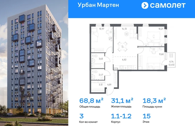 Строим кварталы для жизни с заботой о будущем. Предлагается 3-комнатная квартира комфорт-класса 69,7 кв.м в корпусе 1.1-1.2 на 15 этаже, в ЖК «Урбан Мартен» Квартира с предчистовой отделкой. Доступность дополнительных опций уточняйте у застройщика. Приобрести квартиру возможно по специальным акциям от застройщика, с текущими условиями акций можно ознакомиться в блоке «Акций». Цена динамическая и может отличаться, уточняйте актуальность у застройщика. В жилом комплексе «Урбан Мартен» у вас будет собственная Уфа: домашняя, неторопливая, теплая. Здесь дети будут играть во дворе без машин в догонялки, собака сможет бегать за палкой по пляжу, а с соседями получится встречаться не только у лифта, но и на утренних занятиях йогой на зеленой лужайке рядом с домом. Жилой комплекс «Урбан Мартен» находится в Демском районе — самом тихом и зеленом в Уфе. Здесь можно открывать окна нараспашку, чтобы квартира наполнялась свежим воздухом, и наблюдать с балкона, как покачиваются макушки деревьев. #yan19-2r1811120#О застройщике