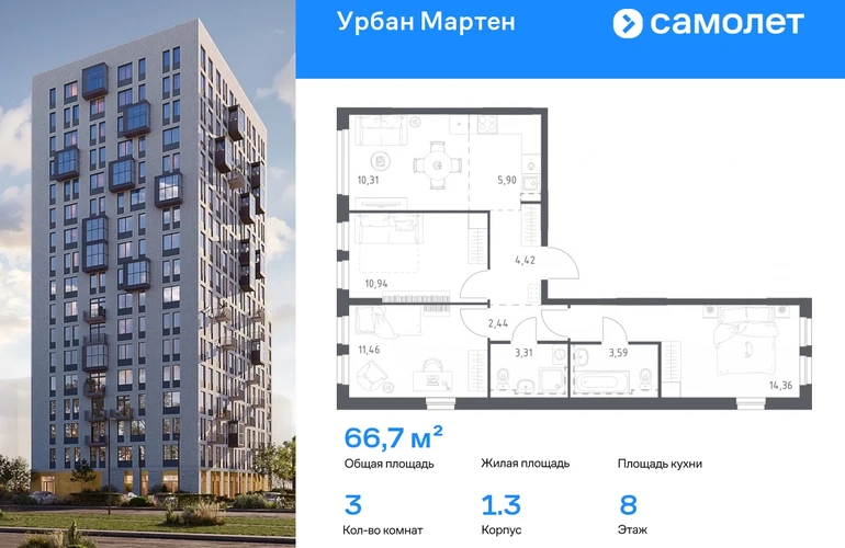 Строим кварталы для жизни с заботой о будущем. Предлагается 3-комнатная квартира комфорт-класса 66,73 кв.м в корпусе 1.3 на 8 этаже, в ЖК «Урбан Мартен» Квартира с предчистовой отделкой. Доступность дополнительных опций уточняйте у застройщика. Приобрести квартиру возможно по специальным акциям от застройщика, с текущими условиями акций можно ознакомиться в блоке «Акций». Цена динамическая и может отличаться, уточняйте актуальность у застройщика. В жилом комплексе «Урбан Мартен» у вас будет собственная Уфа: домашняя, неторопливая, теплая. Здесь дети будут играть во дворе без машин в догонялки, собака сможет бегать за палкой по пляжу, а с соседями получится встречаться не только у лифта, но и на утренних занятиях йогой на зеленой лужайке рядом с домом. Жилой комплекс «Урбан Мартен» находится в Демском районе — самом тихом и зеленом в Уфе. Здесь можно открывать окна нараспашку, чтобы квартира наполнялась свежим воздухом, и наблюдать с балкона, как покачиваются макушки деревьев. #yan19-2r1812263#О застройщике