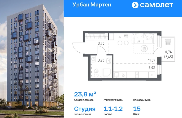Строим кварталы для жизни с заботой о будущем. Предлагается квартира студия комфорт-класса 23,81 кв.м в корпусе 1.1-1.2 на 15 этаже, в ЖК «Урбан Мартен» Квартира с предчистовой отделкой. Доступность дополнительных опций уточняйте у застройщика. Приобрести квартиру возможно по специальным акциям от застройщика, с текущими условиями акций можно ознакомиться в блоке «Акций». Цена динамическая и может отличаться, уточняйте актуальность у застройщика. В жилом комплексе «Урбан Мартен» у вас будет собственная Уфа: домашняя, неторопливая, теплая. Здесь дети будут играть во дворе без машин в догонялки, собака сможет бегать за палкой по пляжу, а с соседями получится встречаться не только у лифта, но и на утренних занятиях йогой на зеленой лужайке рядом с домом. Жилой комплекс «Урбан Мартен» находится в Демском районе — самом тихом и зеленом в Уфе. Здесь можно открывать окна нараспашку, чтобы квартира наполнялась свежим воздухом, и наблюдать с балкона, как покачиваются макушки деревьев. #yan19-2r1812584#О застройщике
