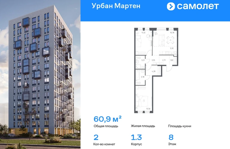 Строим кварталы для жизни с заботой о будущем. Предлагается 2-комнатная квартира комфорт-класса 60,93 кв.м в корпусе 1.3 на 8 этаже, в ЖК «Урбан Мартен» Квартира с предчистовой отделкой. Доступность дополнительных опций уточняйте у застройщика. Приобрести квартиру возможно по специальным акциям от застройщика, с текущими условиями акций можно ознакомиться в блоке «Акций». Цена динамическая и может отличаться, уточняйте актуальность у застройщика. В жилом комплексе «Урбан Мартен» у вас будет собственная Уфа: домашняя, неторопливая, теплая. Здесь дети будут играть во дворе без машин в догонялки, собака сможет бегать за палкой по пляжу, а с соседями получится встречаться не только у лифта, но и на утренних занятиях йогой на зеленой лужайке рядом с домом. Жилой комплекс «Урбан Мартен» находится в Демском районе — самом тихом и зеленом в Уфе. Здесь можно открывать окна нараспашку, чтобы квартира наполнялась свежим воздухом, и наблюдать с балкона, как покачиваются макушки деревьев. #yan19-2r1813179#О застройщике