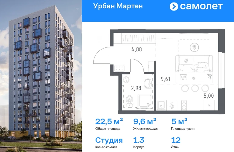 Строим кварталы для жизни с заботой о будущем. Предлагается квартира студия комфорт-класса 22,47 кв.м в корпусе 1.3 на 12 этаже, в ЖК «Урбан Мартен» Квартира с предчистовой отделкой. Доступность дополнительных опций уточняйте у застройщика. Приобрести квартиру возможно по специальным акциям от застройщика, с текущими условиями акций можно ознакомиться в блоке «Акций». Цена динамическая и может отличаться, уточняйте актуальность у застройщика. В жилом комплексе «Урбан Мартен» у вас будет собственная Уфа: домашняя, неторопливая, теплая. Здесь дети будут играть во дворе без машин в догонялки, собака сможет бегать за палкой по пляжу, а с соседями получится встречаться не только у лифта, но и на утренних занятиях йогой на зеленой лужайке рядом с домом. Жилой комплекс «Урбан Мартен» находится в Демском районе — самом тихом и зеленом в Уфе. Здесь можно открывать окна нараспашку, чтобы квартира наполнялась свежим воздухом, и наблюдать с балкона, как покачиваются макушки деревьев. #yan19-2r1815980#О застройщике