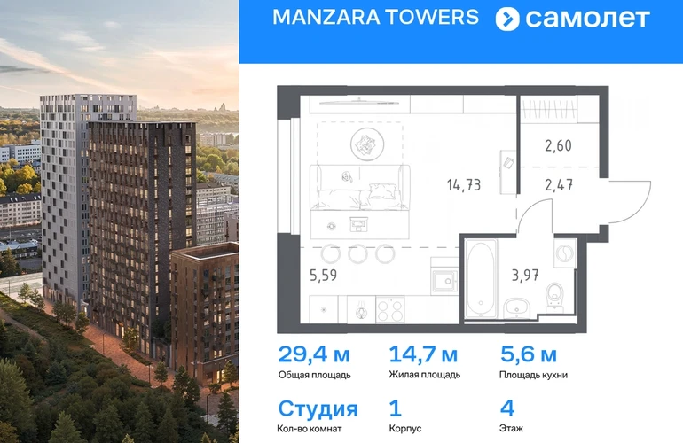 Предлагается квартира студия комфорт-класса 29,36 кв.м в корпусе 1 на 4 этаже, в MANZARA TOWERS Квартира с предчистовой отделкой. Доступность дополнительных опций уточняйте у застройщика. Планировкой предусмотрены: Прихожая - 2,47 м² Кухня-ниша - 5,59 м² Студия - 14,73 м² СУ_1 - 3,97 м² Гардеробная_1 - 2,6 м² Приобрести квартиру возможно по специальным акциям от застройщика, с текущими условиями акций можно ознакомиться в блоке “Акций”. Цена динамическая и может отличаться, уточняйте актуальность у застройщика. Manzara Towers — это дома высотой от 7 до 24 этажей. В увеличенных окнах с зеркальной поверхностью отражаются облака и солнечные блики. Тихий двор с игровыми площадками и воркаут-пространством идеален для прогулок с кофе. На первом этаже есть выход на стилобат, где появятся зеленые оазисы и открытые террасы. Дома соединяет между собой частично прозрачный пешеходный мост. Предусмотрены подземный и 6-этажный многоуровневый паркинги. До ж/д вокзалов можно доехать за 20 минут. Или в обеденный перерыв встретиться с друзьями в центре города — дорога на машине займет около 15 минут. На первых этажах корпусов откроется детская поликлиника, ФОК с бассейном, магазины, кафе и салоны красоты. Для маленьких жителей уже работают 3 детских сада и лицей, до которых можно дойти за 6–15 минут. Во всех наших корпусах входы в светлые лобби находятся на уровне земли. На первом этаже есть специальные места для хранения колясок и велосипедов. #yan19-2r1714001#О застройщике